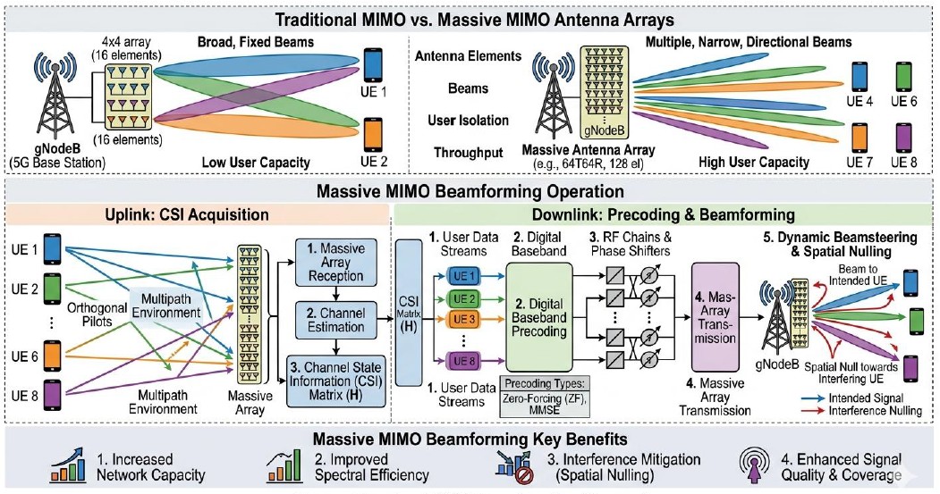 A massive MIMO (Multiple-Input Multiple-Output) system is an advanced wireless communication technique where a base station uses a very large number of antennas (tens to hundreds) to serve many users simultaneously in the same time-frequency resource.