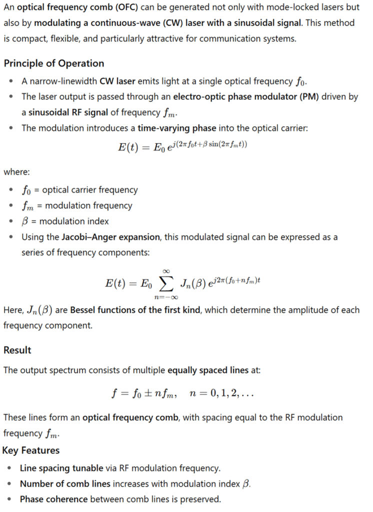 An OFC is typically generated using a mode-locked laser, which emits a train of ultra-short pulses at a fixed repetition rate frep. In the frequency domain, this pulse train corresponds to a set of narrow lines spaced by frep, with the entire comb offset by a frequency fceo (carrier–envelope offset). Each frequency in the comb can be expressed as: