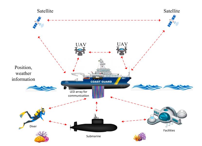 The application landscape of OWC in 6G and beyond is extensive. In drone communication, optical links can support secure and interference-free connectivity for delivery, surveillance, and defense UAVs. In satellite networks, FSO enables ultra-high-speed satellite-to-satellite and satellite-to-ground links, potentially reaching terabit-per-second capacities. Underwater communication systems can use optical signals for marine exploration, offshore operations, and defense applications. Vehicular networks (V2V and V2I) can leverage OCC techniques, such as rolling shutter-based reception, to enable short-range communication between vehicles. In smart cities, VLC and LiFi integrated into streetlights and infrastructure can provide high-speed public connectivity.