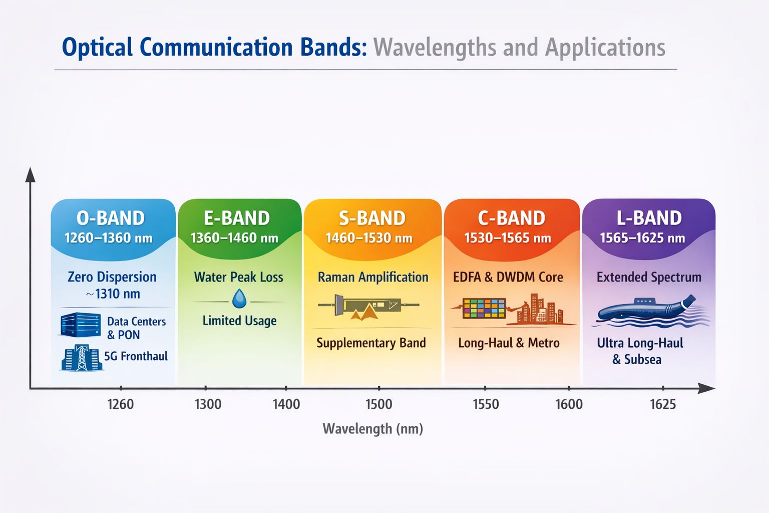 In optical communication systems, wavelength selection is a fundamental design decision rather than a secondary consideration. It directly influences dispersion characteristics, amplification methods, transmission reach, spectral efficiency, and ultimately the scalability and cost-effectiveness of the network. The standard optical bands—O, E, S, C, and L—are each defined by distinct physical properties and system-level trade-offs.